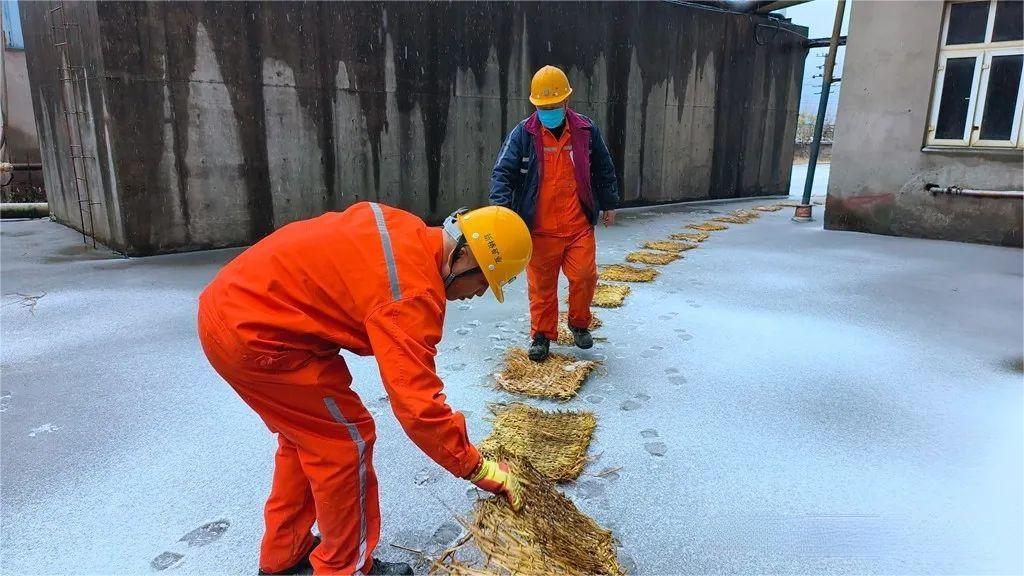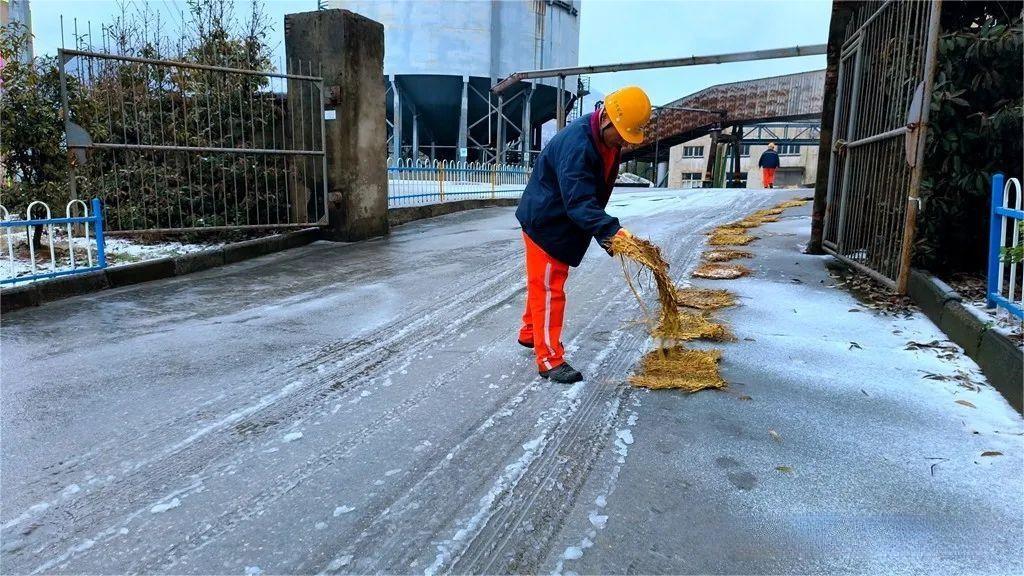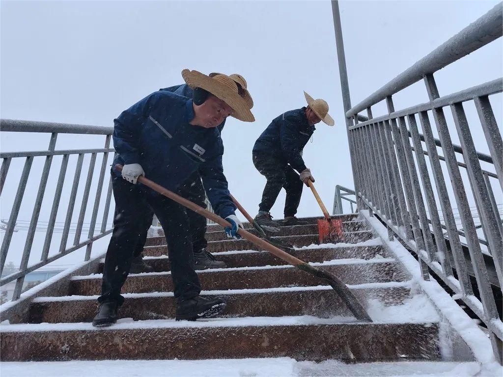 选矿厂、综合保障部迅速组织员工清理厂区、天桥、露天台阶楼梯等处积雪,并铺设防滑草包,保障员工出行安全。