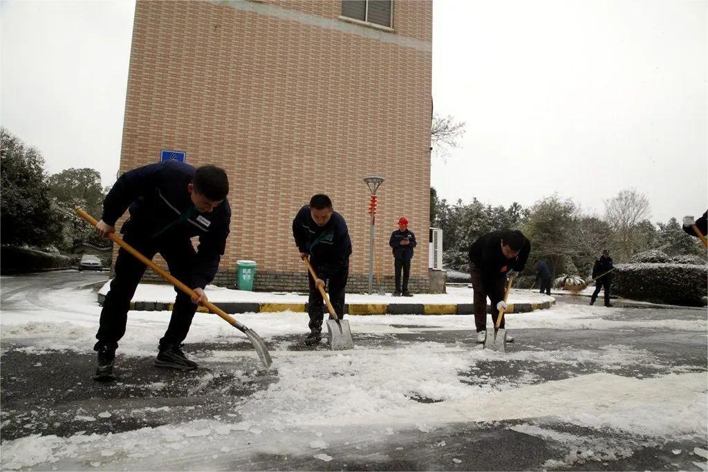 生产管理部组织员工清理办公楼广场积雪,确保进出员工、车辆安全通行。